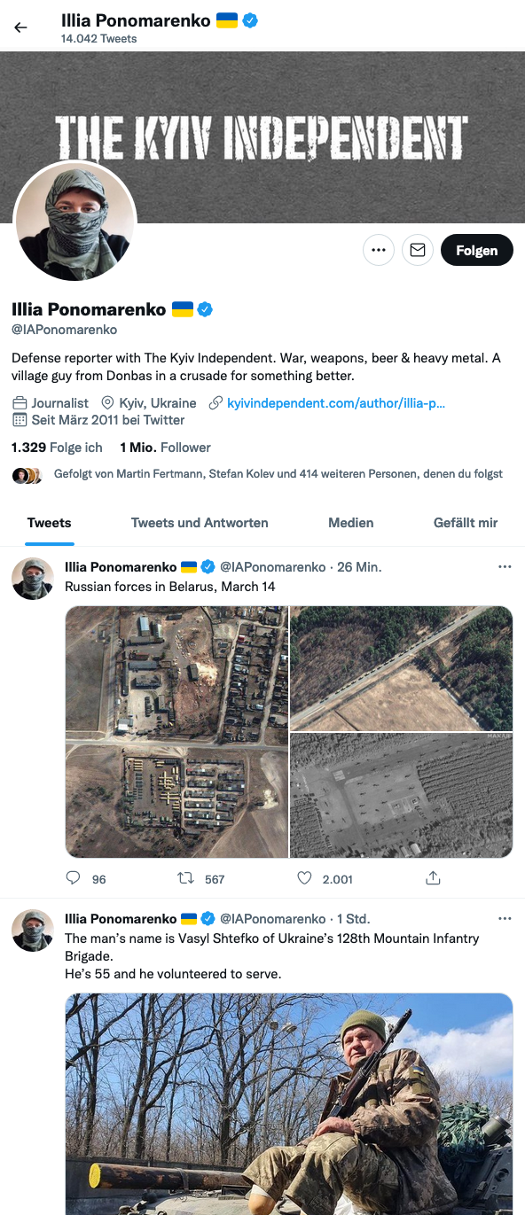 Ein Star des Ukraine-Kriegs ist Illia Ponomarenko. Der Journalist der Zeitung „The Kyiv Independent“, die für ihre unermüdliche Berichterstattung international gefeiert wird, teilt in seinem Twitter-Feed nahezu stündlich neueste Entwicklungen aus dem Kriegsgebiet. Dabei scheut sich Ponomarenko, der aus einer Kleinstadt aus dem Donbass stammt, auch nicht, an der Seite seiner bewaffneten Landsleute die Gefechte zu verfolgen. Objektiv ist er nicht. Gelegentlich teilt er Bilder von Panzerabwehrwaffen oder Sturmgewehren und schreibt Sätze wie: „Ich kann bestätigen, diese Babys befinden sich quasi an jeder Ecke auf ukrainischer Seite.“ Manche seiner Follower sind besorgt, dass er mit Fotos den russischen Diensten wichtige Informationen liefert. Aber Ponomarenko scheint zu wissen, was er tut.