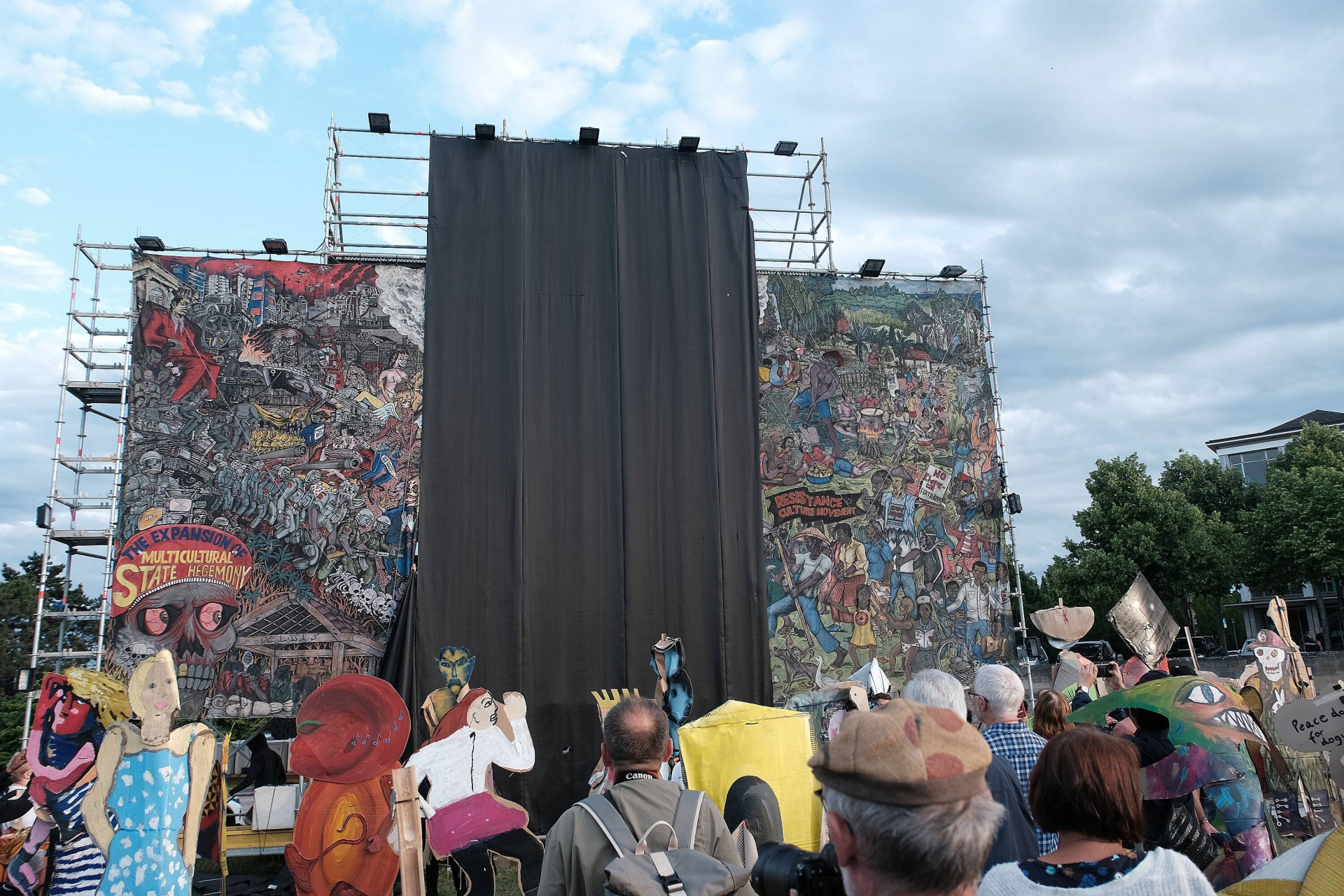 Zurück zur documneta 15. Bereits im Vorfeld waren die Veranstalter und das kuratierende Kollektiv Ruangrupa mit berechtigten Rassismus- und Antisemitismusvorwürfen konfrontiert worden, unter anderem auf dem Blog des „Kasseler Bündnisses gegen Antisemitismus“. Dennoch wurde ein sehr umstrittenes Werk des indonesischen Kollektivs Taring Padi ausgestellt. Auf dem bereits 20 ahre alten Großplakat sind eindeutig antisemitische Motive zu sehen. So sind auf dem schwarzen Hut eines Mannes, der scheinbar eine Schläfenlocke trägt, SS-Runen dargestellt. Ein weiterer Mann mit Schweinsnase wird als Angehöriger des Mossad ausgewiesen.