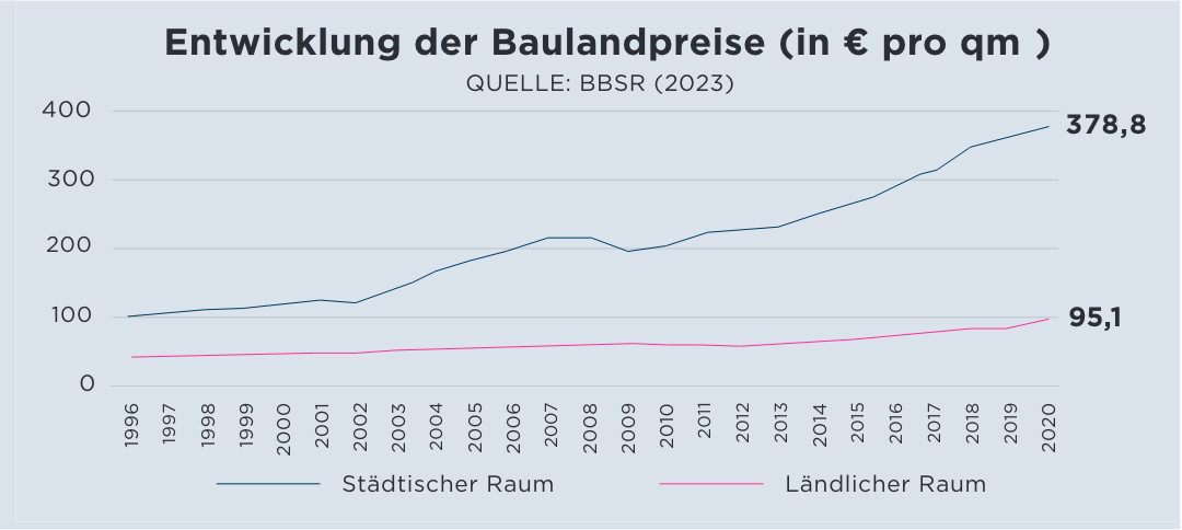 Es kam ganz anders. In den letzten 30 Jahren beobachten wir eher das Gegenteil. Die Städte wachsen deutlich schneller als die ländlichen Regionen. Bei in etwa stagnierender Bevölkerung Deutschlands gibt es einen Trend zur Abwanderung vom Land in die Stadt, und der konzentriert sich vor allem auf jüngere, gut ausgebildete Menschen. Am deutlichsten ist dies an den Baulandpreisen abzulesen. Die vom Bundesinstitut für Bau-, Stadt- und Raumplanung (BBSR) ermittelten Zahlen belegen eindrücklich: Lagen die Baulandpreise Mitte der Neunzigerjahre in den urbanen Regionen noch im Durchschnitt doppelt so hoch wie in den ländlichen Räumen, so stieg der Abstand bis 2020 auf das Vierfache an, und zwar recht kontinuierlich im Trend – bis in die Gegenwart.