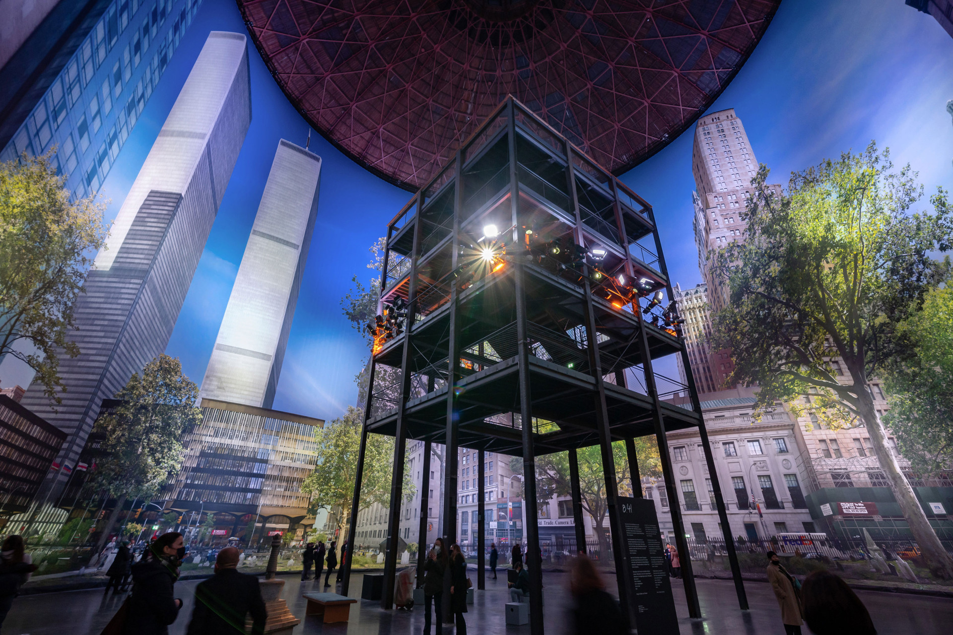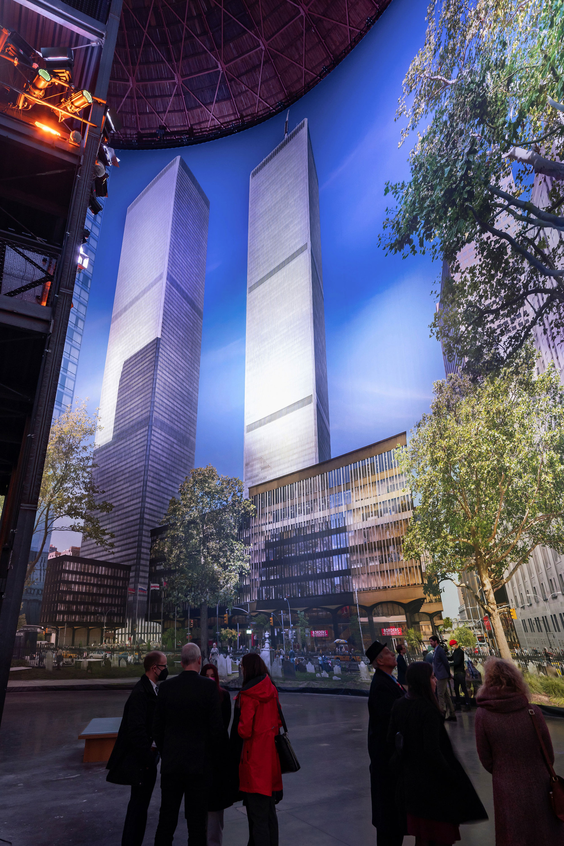 Erst nach dem Rundgang durch diese Räume gelangt man zur Aussichtsplattform vor dem großen Panorama. Der Blick schweift durch die Bäume des Friedhofs der Kirche St. Pauls Chapel, über die Grabsteine und hinüber zum Zaun, hinter dem der typische New Yorker Alltagstrubel stattfindet. Weit oben ragen die beiden Hochhäuser in den hellblauen Himmel. Wenige Minuten später wird ein Flugzeug in den Nordturm des World Trade Centers einschlagen. Und die Welt, die wir kannten, für immer verändern.